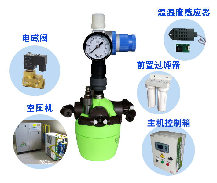 利用空壓機(jī)氣體將水霧化,水霧顆粒細(xì)、揮發(fā)快、效率高。